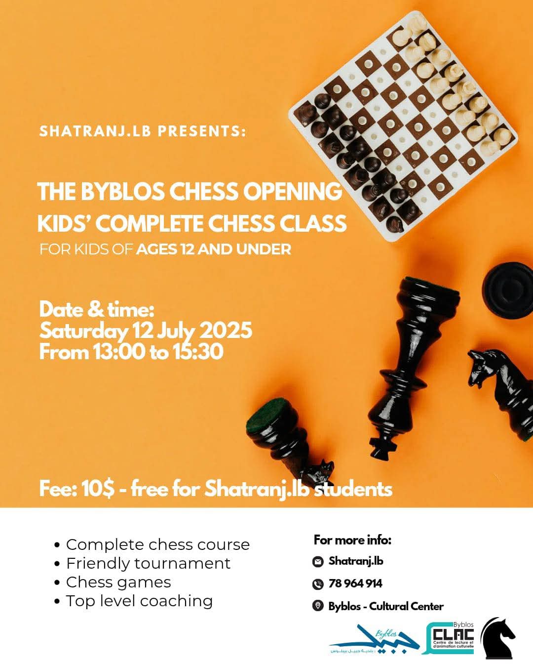 يسرّنا دعوتكم للمشاركة في “افتتاحية بيبلوس للشطرنج”، وهي دورة شاملة للأطفال لتعلّم الشطرنج، من تنظيم Shatranj.lb بالتعاون مع المركز الثقافي البلدي في جبيل، وذلك نهار السبت ١٢ تموز ٢٠٢٥ من الساعة ١:٠٠ بعد الظهر حتى ٣:٣٠ عصراً، في حديقة المركز.