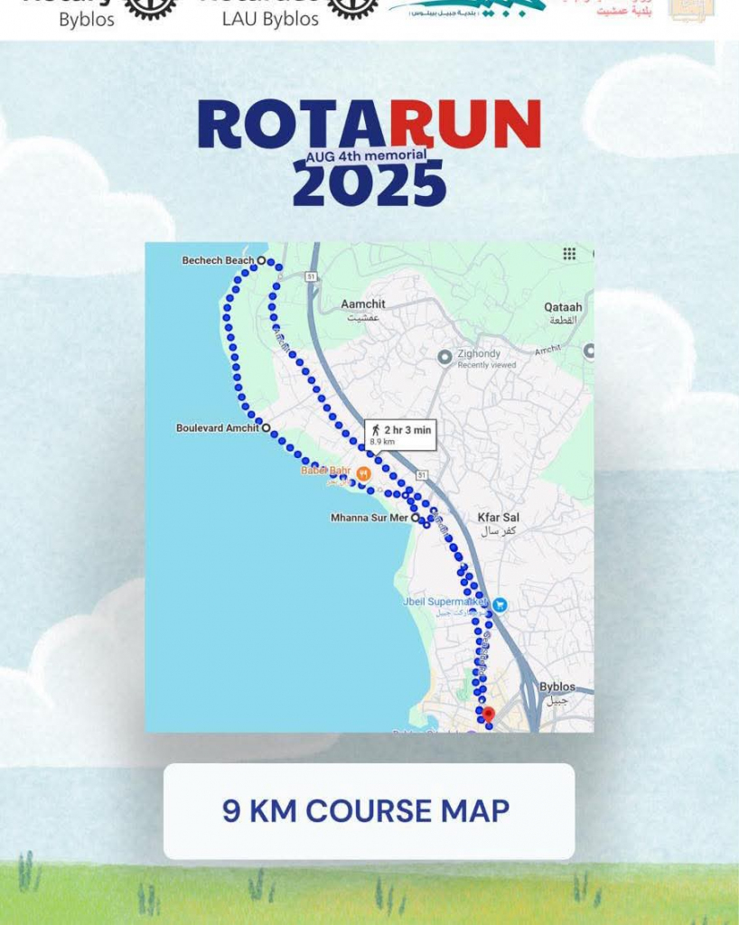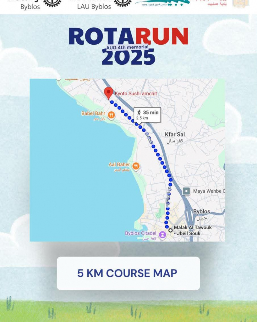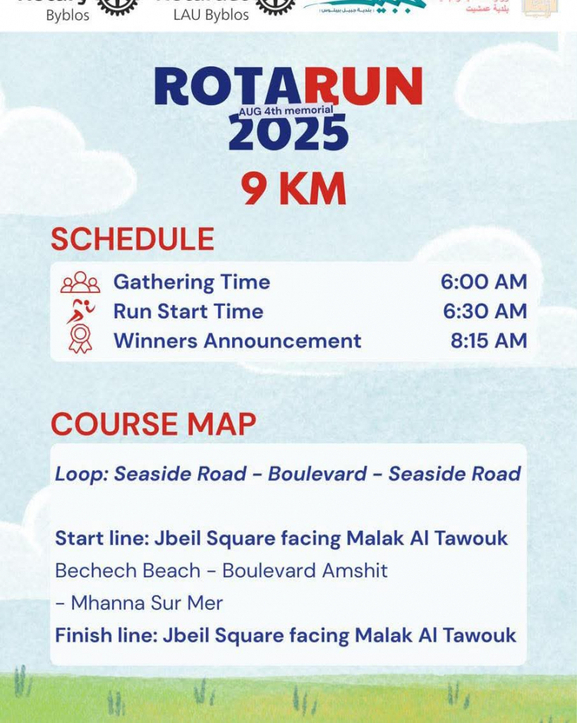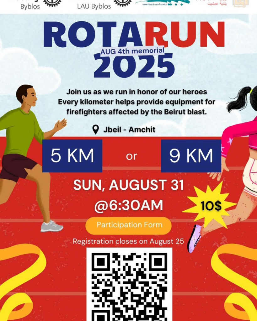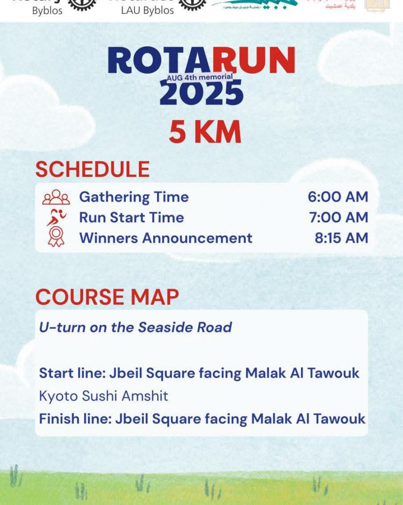 تحت شعار “أركض لئلا ننسى”، وإحياءً لذكرى ضحايا انفجار بيروت، تدعوكم بلدية جبيل – بيبلوس للمشاركة في سباق RotaRun ٢٠٢٥ الذي ينظمه نادي روتاراكت جامعة LAU جبيل ونادي روتاري جبيل.
