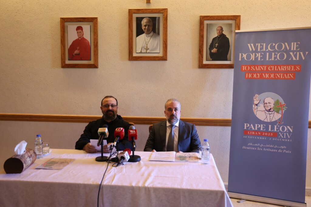 رئيس بلدية عنايا كفربعال مارك عبود والمسؤول الإعلامي في دير مار مارون للاب يوسف متى عقدا مؤتمرا صحفيا مشتركا في صالون الدير عرضا فيه برنامج زيارة البابا لاوون الرابع عشر الى لبنان وخصوصا زيارته الحج الى دير مار مارون عنايا _ دير مار شربل .