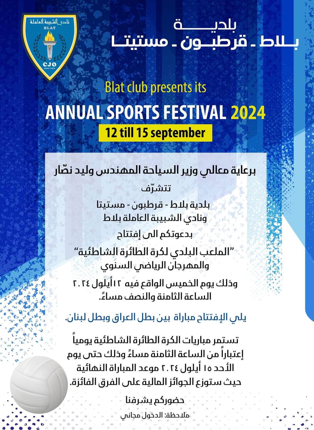 افتتاح الملعب البلدي لكرة الطائرة الشاطئية في بلاط والمهرجان الرياضي السنوي سبتمبر 12, 2024 ShareShareShare Previous Postالنائب ابي رميا : الحقيقة تحرّركم Next Postمنتدى الشاعر جورج لطيف للشعر والثقافة يكرّم الشاعر اميل نون في مشمش قد يعجبك أكتوبر 30, 2024 التّمديد 2 لقائد الجيش يسبق الميدان والرّئاسة أكتوبر 9, 2025 باسيل: لبنان أكثر من يدرك أن السلام الحقيقي لا يقوم إلا على العدالة أغسطس 14, 2025 تكريس لوحة سيدة البيدر في حصارات برعاية المطران ميشال عون ضمن احتفالات عيد انتقال العذراء أغسطس 14, 2024 الطبال والراقصة