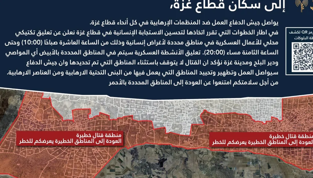 ونشر أدرعي عبر منصة “إكس” خريطة تُبيّن باللون الأبيض المناطق التي ستشملها الهدنة الموقّتة في قطاع غزة، وهي المواصي ودير البلح ومدينة غزة، إضافة إلى المناطق التي سيتواصل فيها القتال كما تظهر باللون الأحمر.