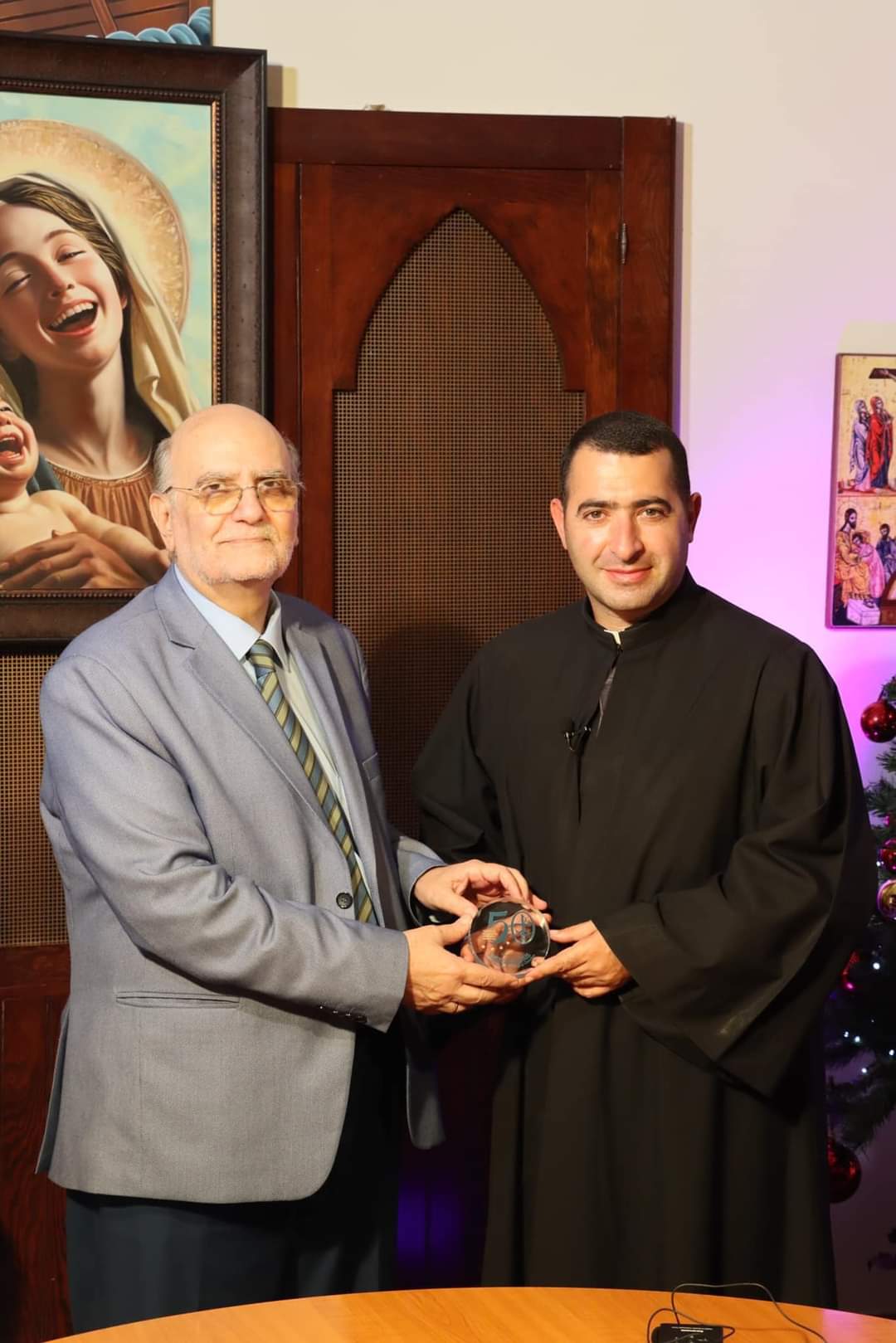 في ختام اللّقاء، قدّم الأمين العام البروفسور د. ميشال عبس إلى الخوري شربل الخوري ميداليّة السنة الخمسين لتأسيس مجلس كنائس الشرق الأوسط كعربون محبّة وتقدير.