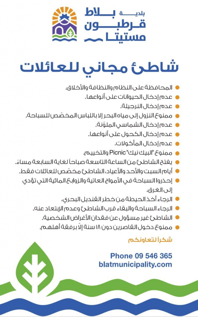 تعلن بلدية بلاط قرطبون ومستيتا عن افتتاح بوابة البحر وموسم الصيف لرواد السباحة ابتداءً من اليوم الأحد ١٥ حزيران، من العاشرة صباحًا وحتى السابعة مساءً.