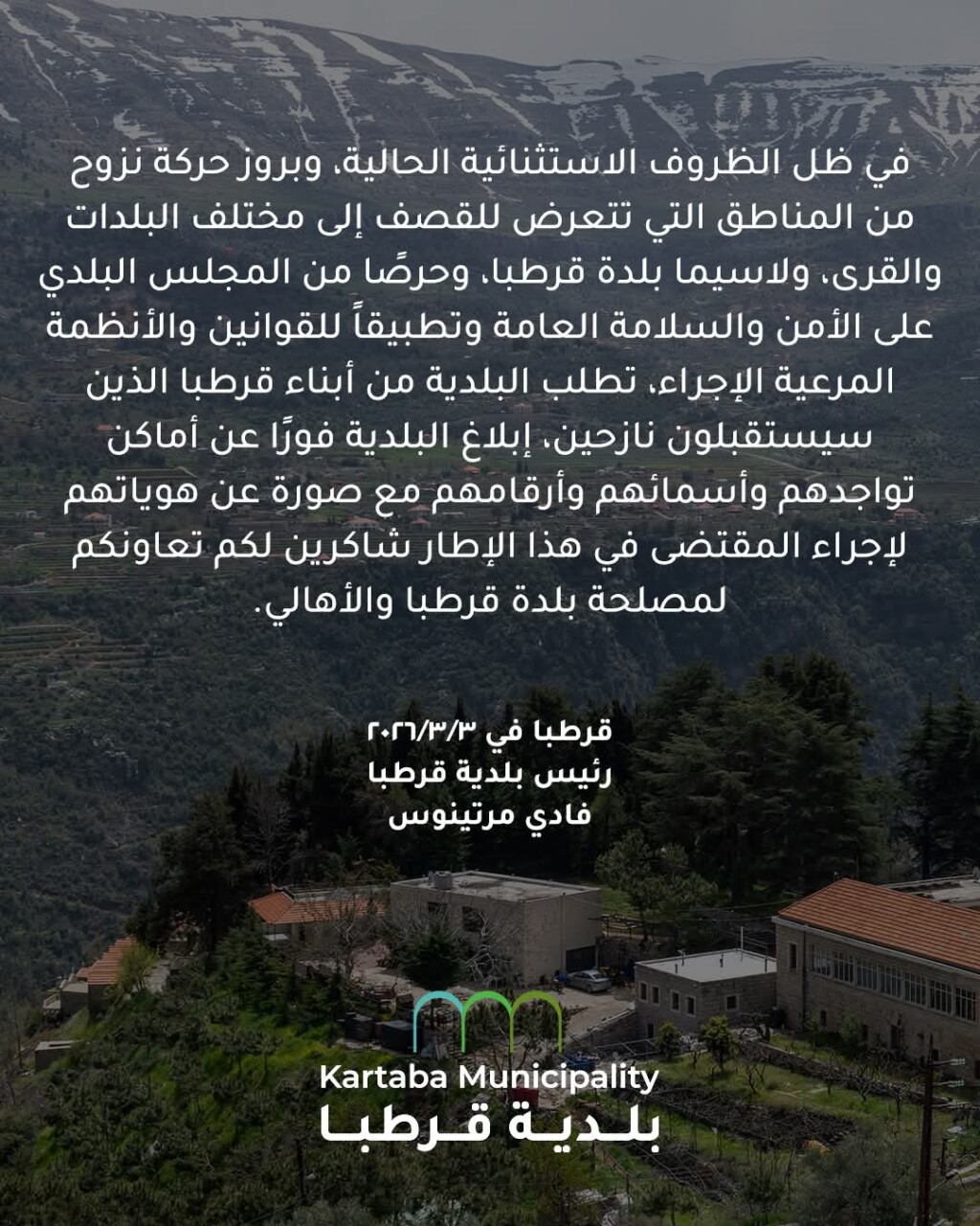 في ظل الظروف الاستثنائية الحالية، وبروز حركة نزوح من المناطق التي تتعرض للقصف إلى مختلف البلدات والقرى، ولاسيما بلدة قرطبا، وحرصًا من المجلس البلدي على الأمن والسلامة العامة وتطبيقاً للقوانين والأنظمة المرعية الإجراء، تطلب البلدية من أبناء قرطبا الذين سيستقبلون نازحين، إبلاغ البلدية فورًا عن أماكن تواجدهم وأسمائهم وأرقامهم مع صورة عن هوياتهم لإجراء المقتضى في هذا الإطار شاكرين لكم تعاونكم لمصلحة بلدة قرطبا والأهالي.