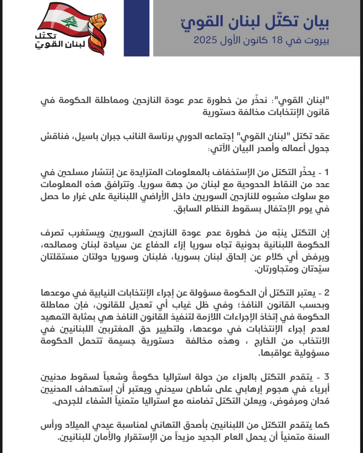 بيان تكتل لبنان القوي ديسمبر 18, 2025 ShareShareShare Previous Postمقابلة مع د. زينة زغيب بمناسبة اليوم العالمي للغة العربية. Next Postبعد اكتمال النصاب… جلسة تشريعية لمجلس النواب قد يعجبك مايو 7, 2024 مشاركة حزب القوات اللبنانية بزيارة استطلاعية الى الصين أبريل 8, 2024 العشائر العربية تدين خطف باسكال سليمان وتحذر نوفمبر 21, 2025 نديم الجميّل يحيي ذكرى بيار الجميّل: رمز السيادة وركن من ثورة 14 آذار يونيو 16, 2025 “اليونيفيل”: التزام ضمان الأمن على طول الخط الأزرق