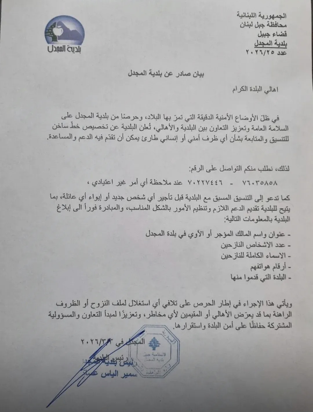 بيان صادر عن بلدية المجدل مارس 4, 2026 ShareShareShare Previous Postتعميم بلدية بلاط – قرطبون – مستيتا بشأن الإبلاغ عن إيواء وتأجير نازحين Next Postالجنوب والبقاع والضاحية تحت النار.. انذارات وغارات اسرائيلية وتوغل قد يعجبك يناير 13, 2026 “تتجاوز الضربات الجوية”.. خيارات جديدة لترامب ضد إيران يناير 17, 2026 وزيرة التربية تترك لإدارات المدارس اتخاذ قرار الإغلاق في ظل الأحوال الجوية فبراير 22, 2026 الفرصة الأخيرة للدبلوماسية.. واشنطن ننتظر من طهران عرضا نوويا مفصلا خلال 48 ساعة والا.. سبتمبر 22, 2025 بدء تحركات للعسكريين للمتقاعدين في مناطق عدة