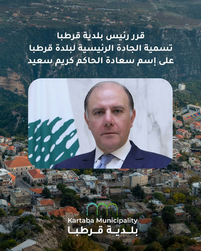 تسمية الجادة الرئيسية في قرطبا باسم حاكم مصرف لبنان كريم سعيد أبريل 2, 2025 أصاب رئيس بلدية قرطبا الأستاذ فادي مرتينوس بتسمية الجادة الرئيسية لبلدة قرطبا على اسم حاكم مصرف لبنان كريم سعيد ، وهو قرار يعني كل قضاء جبيل .فشكرا لرئيس البلدية / رئيس الاتحاد فادي مرتينوس . ShareShareShare Previous Postالتزامًا بالشفافية: تصريح الذمة المالية لوزارة السياحة اللبنانية Next Postبالأرقام: بلديّاتٌ مشلولة وأُخرى منحلّة! قد يعجبك يوليو 13, 2024 زحمة مبادرات والمياه الرئاسية راكدة مايو 29, 2024 وزير الطاقة والمياه وليد فياض يعقد مؤتمراً صحافياً حول مشروع معمل إنتاج الكهرباء بالطاقة الشمسية فبراير 22, 2024 نقابة ونقيب محرري الصحافة اللبنانية يرثيان الصحافي الكبير كميل منسى نوفمبر 21, 2024 عون: حملات التحريض لن تزيد الجيش الا صلابة وتماسكًا