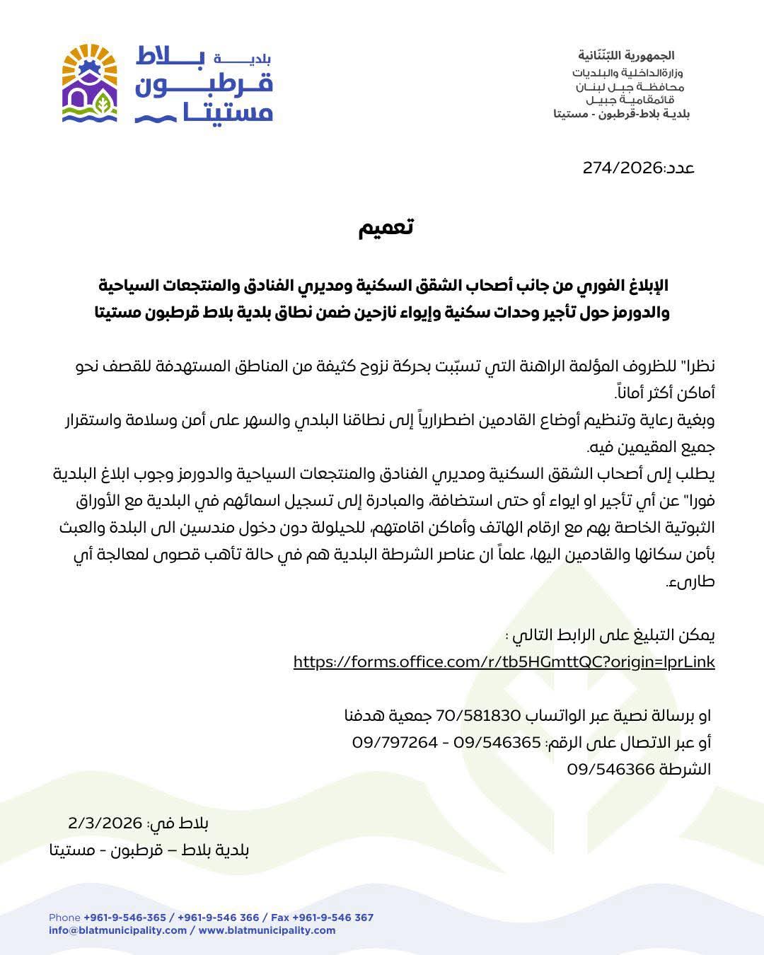 الإبلاغ الفوري من جانب أصحاب الشقق السكنية ومديري الفنادق والمنتجعات السياحية والدورمز حول تأجير وحدات سكنية وإيواء نازحين ضمن نطاق بلدية بلاط قرطبون مستيتا