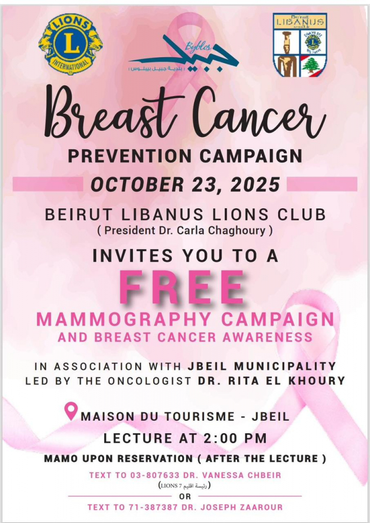 في إطار شهر التوعية حول سرطان الثدي، ينظم نادي ليبانون ليونز بيروت برئاسة الدكتورة كارلا شاغوري، بالتعاون مع بلدية جبيل-بيبلوس، حملة مجانية للتصوير الشعاعي للثدي (Mammography) والتوعية حول مرض سرطان الثدي، وذلك نهار الخميس 23 تشرين الأول 2025 في مركز السياحة -جبيل (Maison du Tourisme).