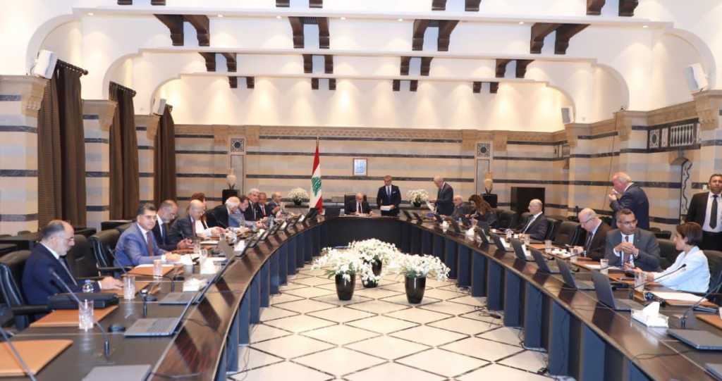 وكان رئيس مجلس الوزراء نواف سلام ترأس جلسة لمجلس الوزراء حضرها نائب رئيس الحكومة طارق متري ووزراء المالية ياسين جابر، الثقافة غسان سلامة، الدفاع ميشال منسى ، السياحة لورا الخازن، الشؤون الاجتماعية حنين السيد، الخارجية والمغتربين يوسف رجي،الاقتصاد والتجارة عامر البساط، المهجرين وشؤون تكنولوجيا المعلومات والذكاء كمال شحادة، الداخلية والبلديات العميد احمد الحجار، العدل عادل نصار، الاتصالات شارل الحاج، الشباب والرياضة نور صار، الاتصالات شارل الحاج، الشباب والرياضة نورا بايراقتداريان، التربية والتعليم العالي ريما كرامي، الصناعة دجو عيس الخوري، شؤون التنمية الادارية فادي مكي،العمل محمد حيدر، الاشغال العامة والنقل فايز رسامني، الزراعة نزار هاني، الاعلام بول مرقص، البيئة تمارا الزين ، الصحة العامة ركان ناصر الدين.