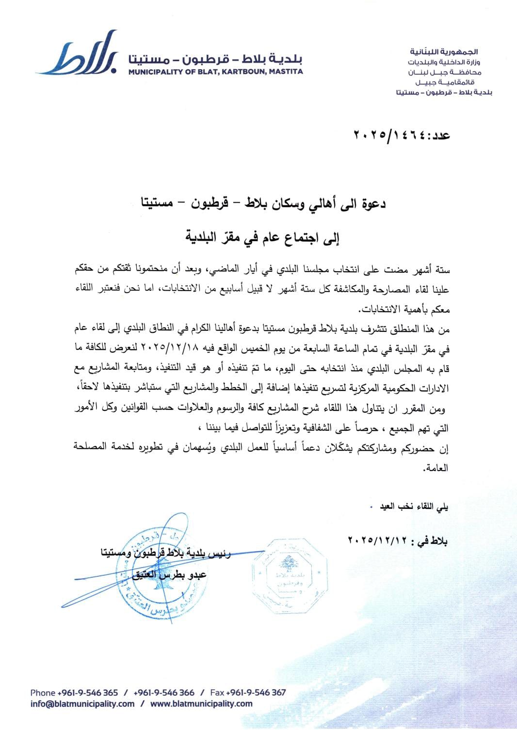 دعوة الى أهالي وسكان بلاط – قرطبون – مستيتا الى اجتماع عام في مقر البلدية ديسمبر 12, 2025 ShareShareShare Previous Postجعجع يبحث المستجدات مع السفير الاميركي Next Postبعبدا تحتفل بالميلاد.. ورسيتال ينشر الفرح والرجاء قد يعجبك مايو 22, 2025 إنتخاب روجيه أنطوان البعيني رئيسًا لبلدية يانوح وهدينه وأندره رامز البعينه نائبًا للرئيس مايو 10, 2024 في الذكرى ال ٢٤ لرحيل ريمون اده أغسطس 10, 2024 مفاوضات 15 آب “الغزاوية”…هل تفتح باب التسوية الاقليمية؟ أبريل 18, 2025 “لائحة حالات الغد ” صدق ، إنماء وأمانة .وتبريكات من صولانج وشارل وقيصر.