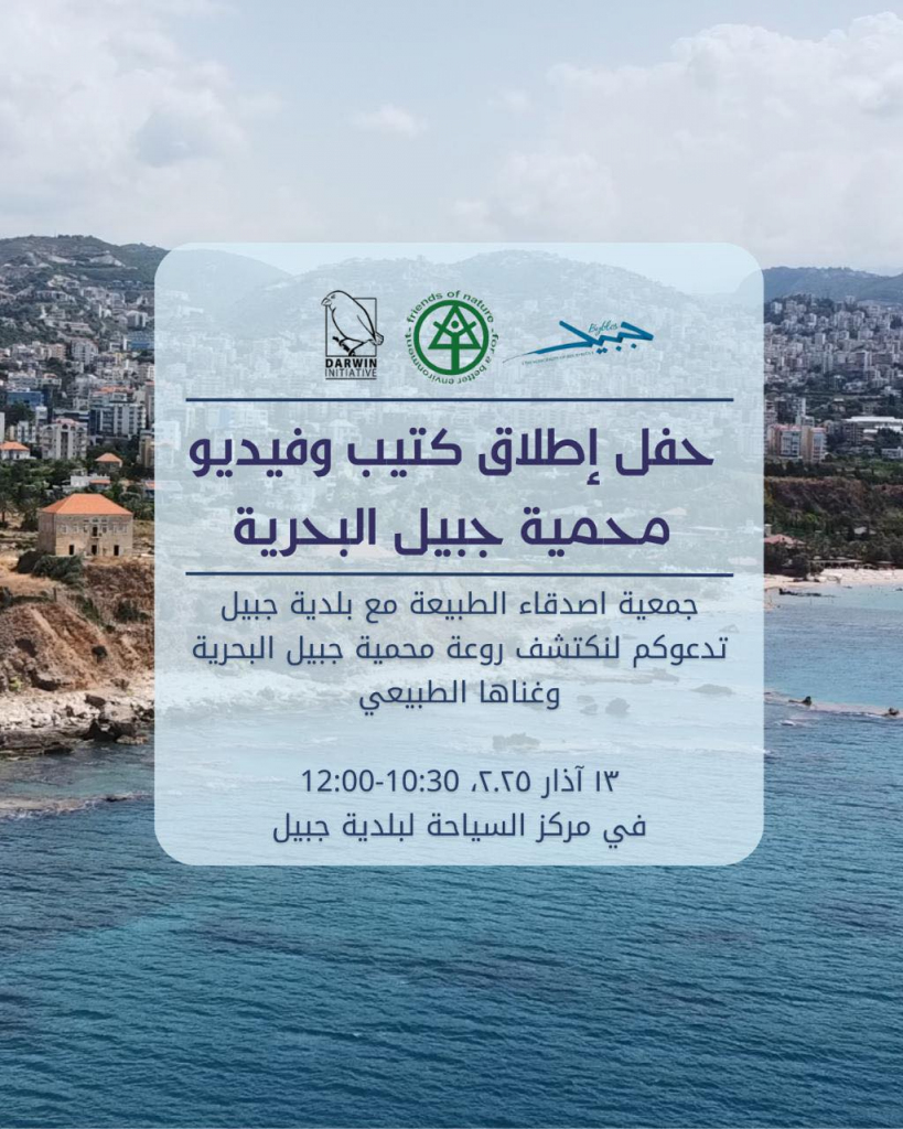 تتشرف جمعية أصدقاء الطبيعة بالتعاون مع بلدية جبيل-بيبلوس بدعوتكم لحضور حفل إطلاق كتيب وفيديو “محميّة جبيل البحريّة”، لاكتشاف روعة هذا الموقع الطبيعي الفريد وغناه البيئي.