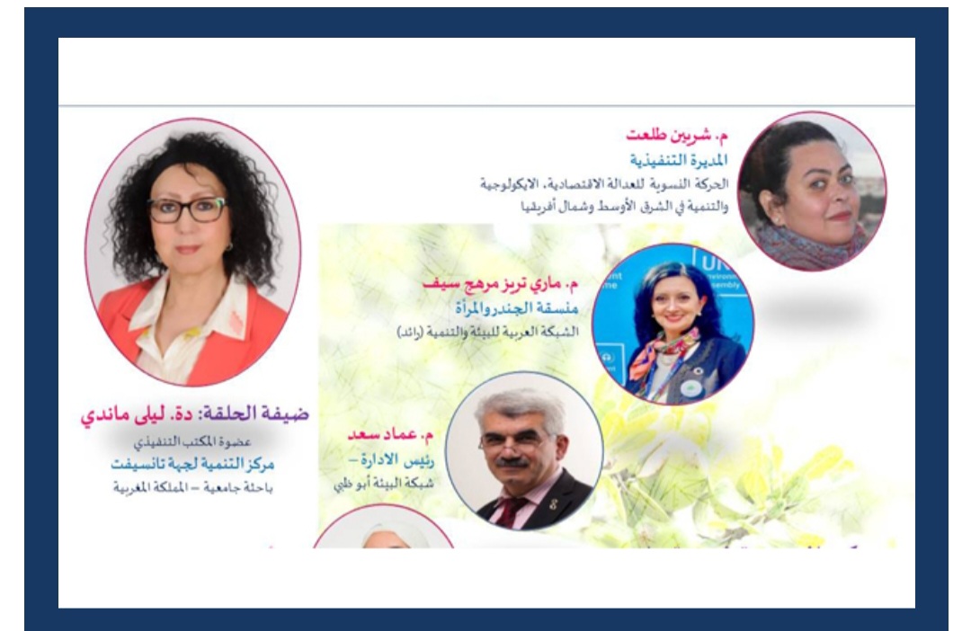 وشارك في الندوة أيضًا الدكتورة شيرين طلعت المديرة التنفيذية في الحركة النسوية من مصر، المهندس عماد سعد رئيس شبكة بيئة ابوظبي من الإمارات، المهندسة أمل داوود علي من مجلس نساء العدالة المناخية من جمهورية مصر العربية، فاطمة زعمة منسقة شبكة تنمية الواحات في شمال افريقيا والشرق الأوسط من المغرب، فاطمة زهراء مطورة شبكة العمل المناخي بالعالم العربي، فاطمة ياسين اعلامية وباحثة في المناخ من جريدة “الصحراء المغربية”، وأدار النقاش الدكتور يوسف الكمري من مركز التنمية لجهة تانسيفت، بالمملكة المغربية.