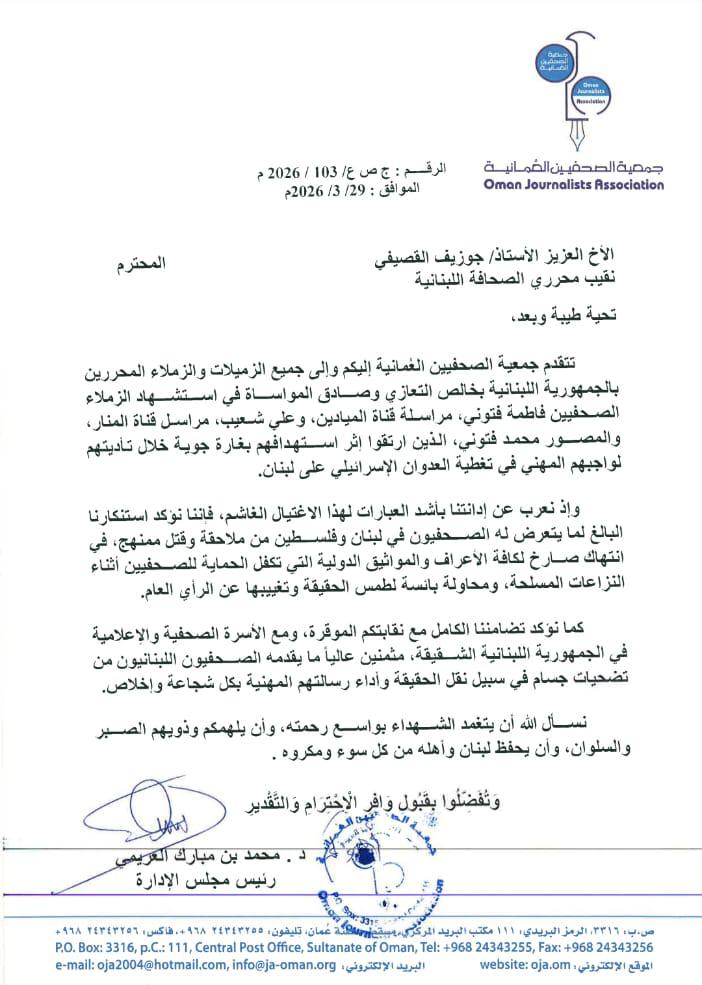 وتابع البيان: كما نؤكد تضامننا الكامل مع نقابتكم الموقرة، ومع الأسرة الصحفية والإعلامية في لبنان الشقيق، مثمنين عاليًا ما يقدمه الصحفيون اللبنانيون من تضحيات جسام في سبيل نقل الحقيقة وأداء رسالتهم المهنية بكل شجاعة وإخلاص.