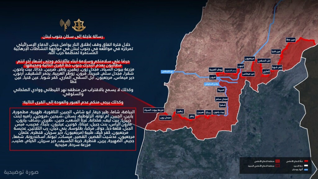 كتب المتحدث باسم الجيش الإسرائيلي أفيخاي أدرعي، عبر منصة “أكس”: “خلال فترة اتفاق وقف إطلاق النار يواصل جيش الدفاع تمركزه في مواقعه بجنوب لبنان في مواجهة النشاطات الإرهابية المستمرة لمنظمة حزب الله. حرصًا على سلامتكم وسلامة أبناء عائلاتكم وحتى إشعار آخر انتم مطالبون بعدم التحرك جنوب خط القرى التالية ومحيطها: مزرعة بيوت السياد, مجدل زون, زبقين, ياطر, صربين، حداثا, بيت ياحون, شقرا, مجدل سلم, قبريخا, فرون, زوطر الغربية, يحمر الشقيف, ارنون, دير ميماس, مرجعيون, ابل السقي, الماري, كفر شوبا, عين قنيا, عين عطا. كما لا يسمح بالاقتراب من منطقه نهر الليطاني ووادي الصلحاني والسلوقي”.