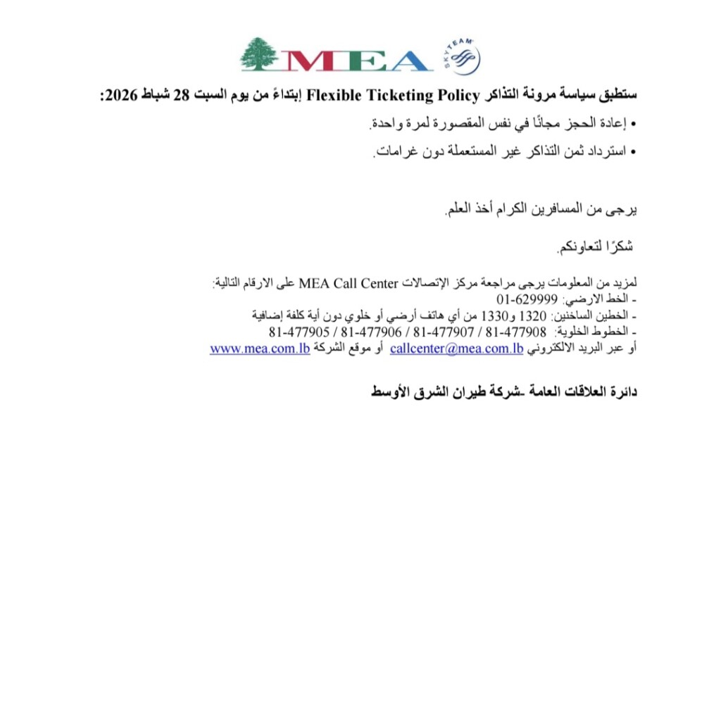 كما انه وبسبب إغلاق المجالات الجوية في معظم دول المنطقة نتيجة التطّورات، أعلنت شركة طيران الشرق الأوسط – الخطوط الجوية اللبنانية بعد ظهر اليوم تعديل بعض الرحلات.