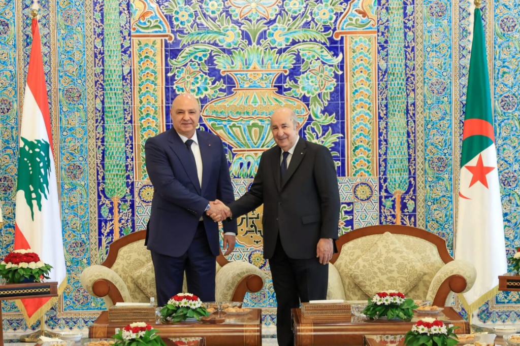 وغادر الرئيس جوزف عون ظهر امس الى الجزائر في زيارة تستمر يومين بدعوة من الرئيس الجزائري عبد المجيد تبون، يرافقه وفد وزاري يضم وزير الخارجية يوسف رجي ووزير الاعلام بول مرقص، ووصلها عند الرابعة من بعد الظهر، واستقبله على ارض مطار هواري بن مدين الدولي الرئيس تبون.