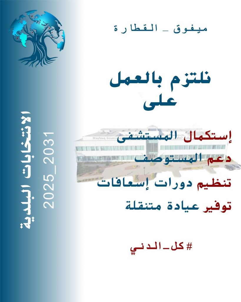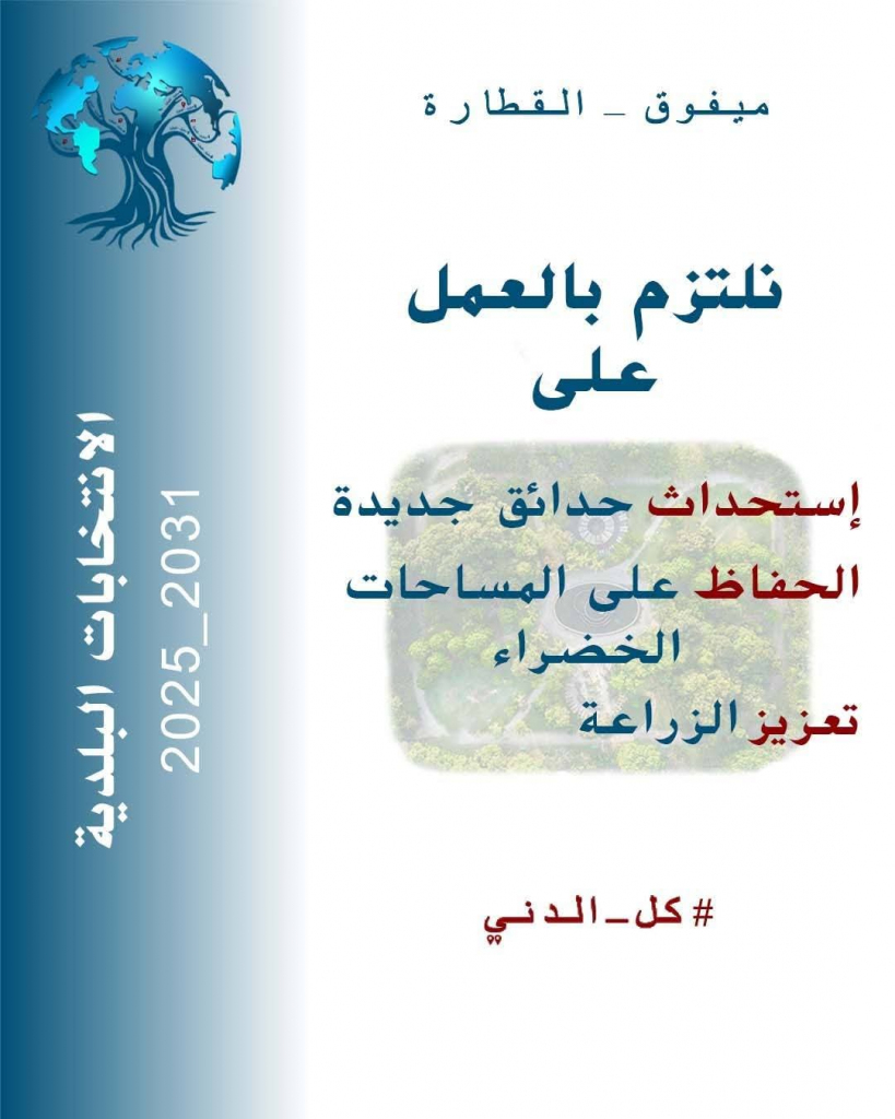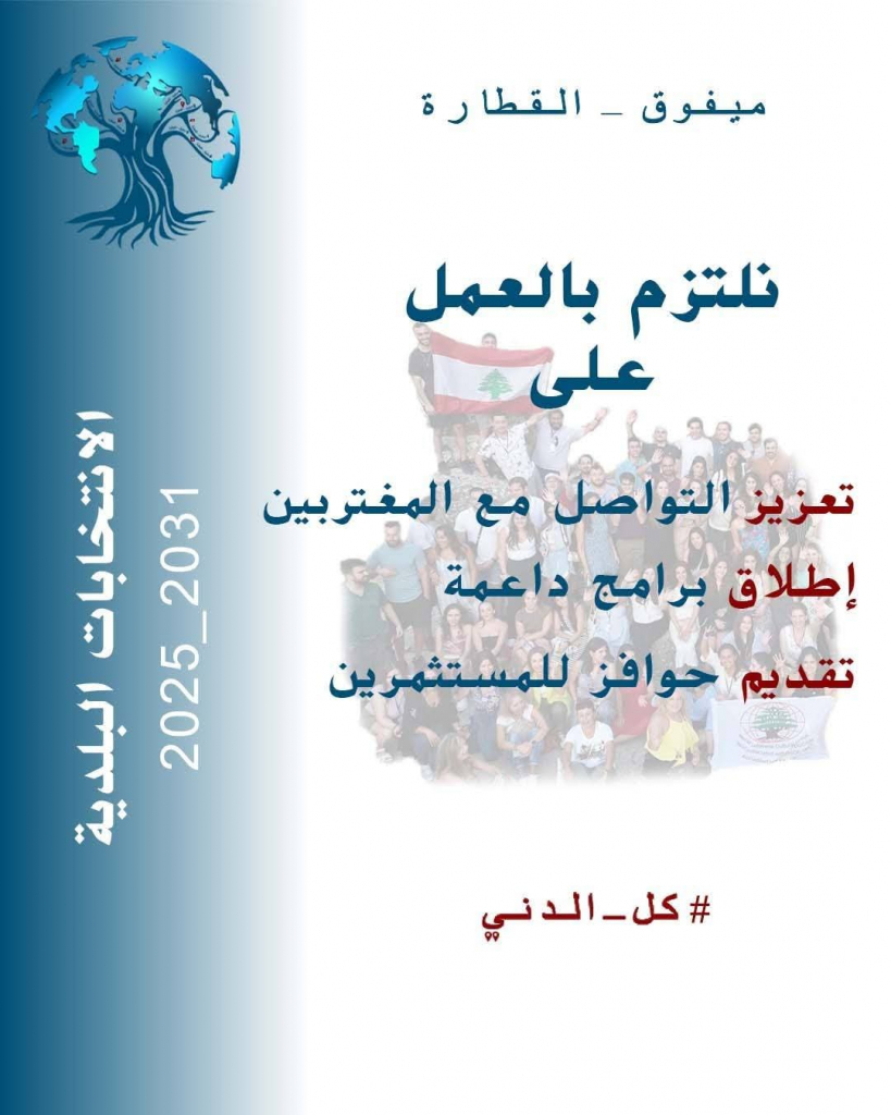 مشروع لائحة الأمل والعمل/ ميفوق القطارة ٢٠٢٥_٢٠٣١ أبريل 28, 2025 ShareShareShare Previous Postلائحة “القرار لترتج” تستنكر التطاول على قائمقام جبيل Next Postالدكتور جوزف الخوري من دار الروابط:معركتنا التغيير من أجل التجديد، وعمشيت تستحق.لائحتنا ” الأمل ” تلتزم بكل عمل لعمشيت أفضل. قد يعجبك أكتوبر 11, 2024 حمية: نثني على إدارة المديرية العامة للطيران المدني وإشرافها على حسن سير العمل في المطار يناير 9, 2025 حنكش للـLBCI: دول العالم تتجه انظارها على البرلمان وهذا ضغط على ضمائر من لم يسمِّ مرشحًا مارس 3, 2025 لاقونا عالشارع الروماني أغسطس 7, 2024 مهرجان «درب العيد – مشمش 2024» يختتم فعاليات النسخة الثانية بقداس عيد مار ضومط وسهرة فولكلورية مع عاصي بيطار