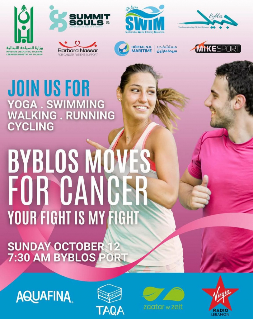 برعاية وزارة السياحة وبالتعاون مع بلديّة جبيل-بيبلوس و swim initiative تنظّم جمعيّة “أرواح القمم” (Summit Souls) نشاطاً رياضيّا خيريّاً يوم الأحد ١٢ تشرين الأول، الساعة ٧:٣٠ صباحاً عند مرفأ جبيل.