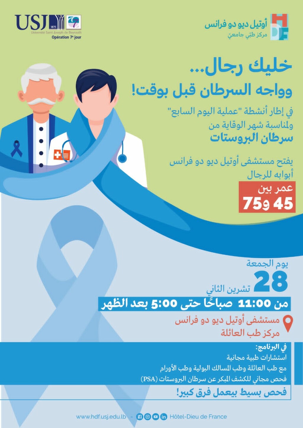 دعوة من مستشفى أوتيل ديو دو فرانس للمشاركة في يوم توعوي عن الوقاية من سرطان البروستات ضمن فعاليات “عملية اليوم السابع”، وذلك في مبادرة مخصصة لدعم صحة الرجال وتعزيز الوقاية المبكرة.